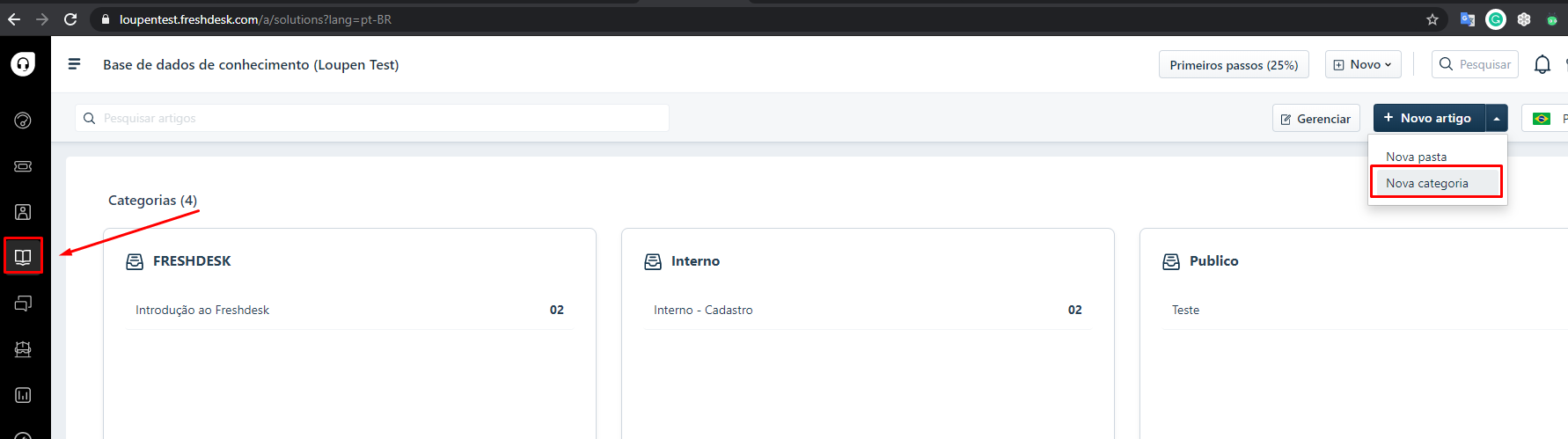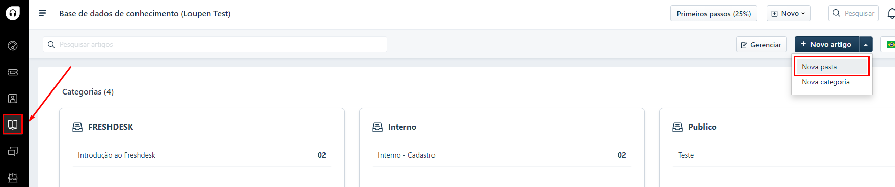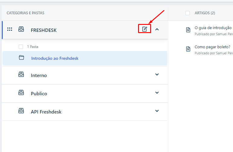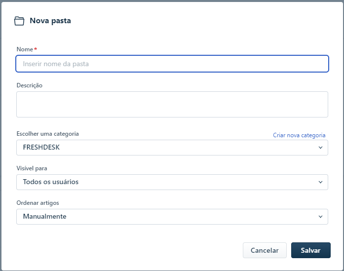 Para maior clareza, a base de conhecimento do Freshdesk é categorizada em uma hierarquia de três níveis - Categorias que contêm um grupo de conteúdo relacionado, Pastas em cada categoria e Artigos de Solução específicos em cada pasta.