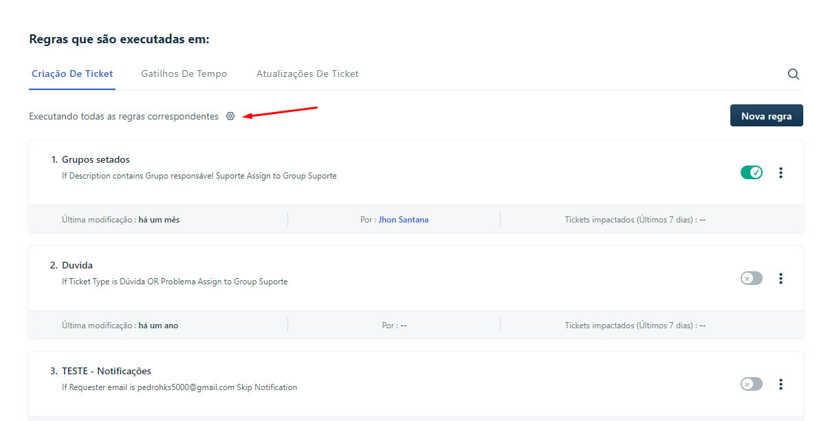 A ordem das regras é muito importante porque, em qualquer ticket, apenas a primeira regra correspondente será executada.