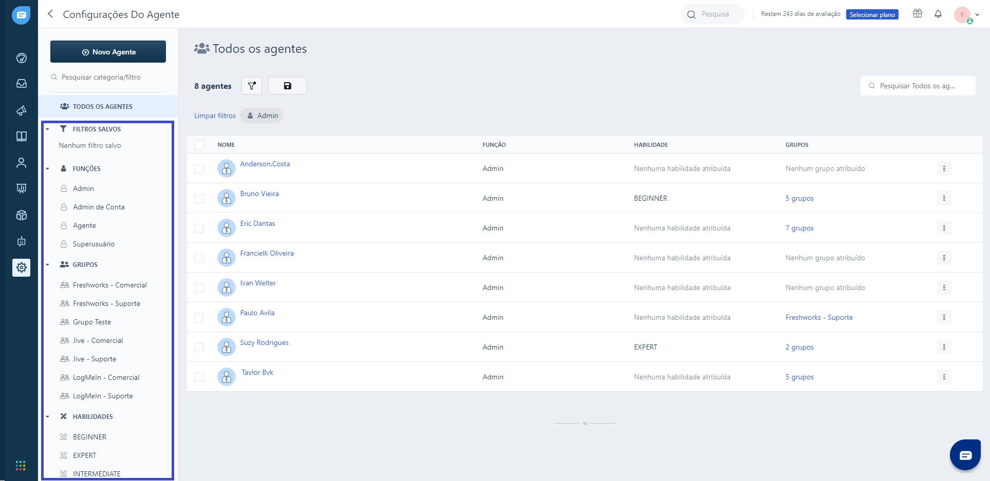 Você pode criar filtros personalizados, selecionando um grupo de agentes.