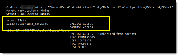 Você pode executar o distinguishedName do comando "atributo personalizado para verificar as permissões de seus usuários AD: