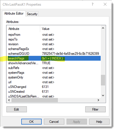 AVISO! Se o atributo searchFlags não estiver configurado como CONFIDENCIAL (por exemplo, exibido como INDEX), você deverá configurá-lo como CONFIDENCIAL .