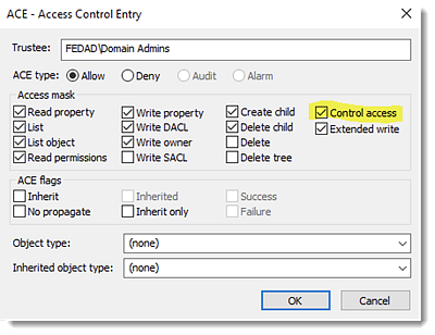 - Em seu servidor Active Directory, execute ldp.exe e confirme se o grupo designado do usuário AD tem ACESSO DE CONTROLE habilitado.