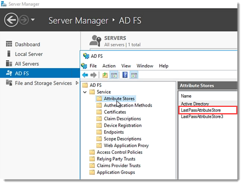 Se o plug-in do AD FS foi instalado corretamente, você pode encontrar o LastPassAttributeStore listado.